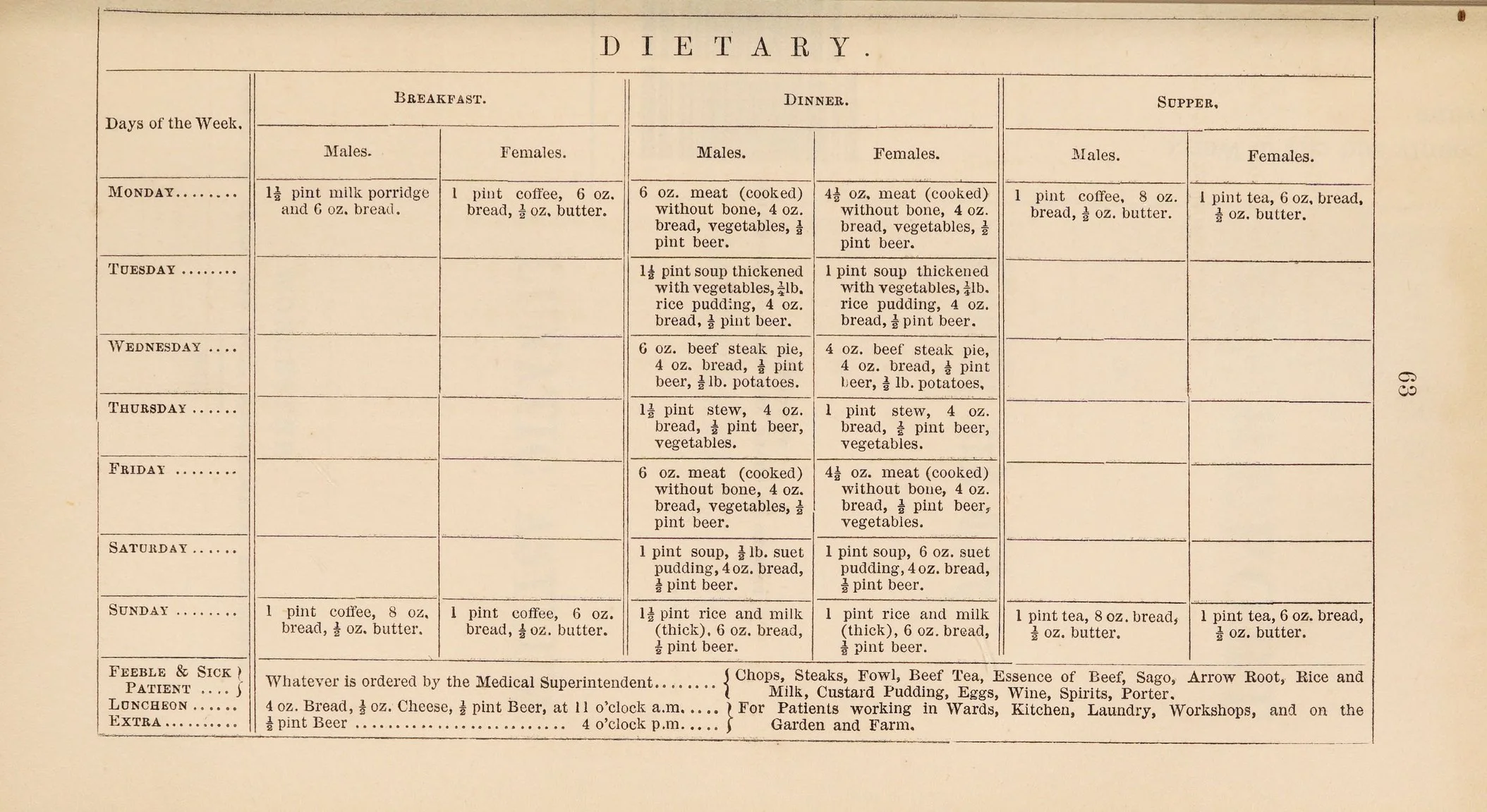 A typical breakfast at the asylum was porridge and bread, and supper usually consisted of tea or coffee, and bread and butter. Dinner was more varied, but generally included meat, vegetables, rice pudding, soup, pie, and potatoes. Lunch was given to patients who were involved in physical labour.