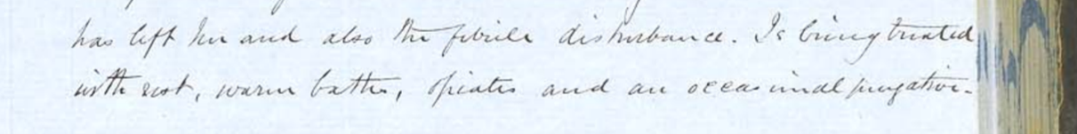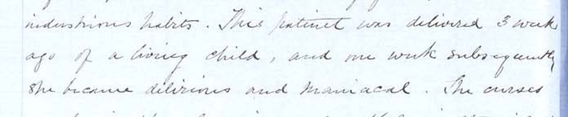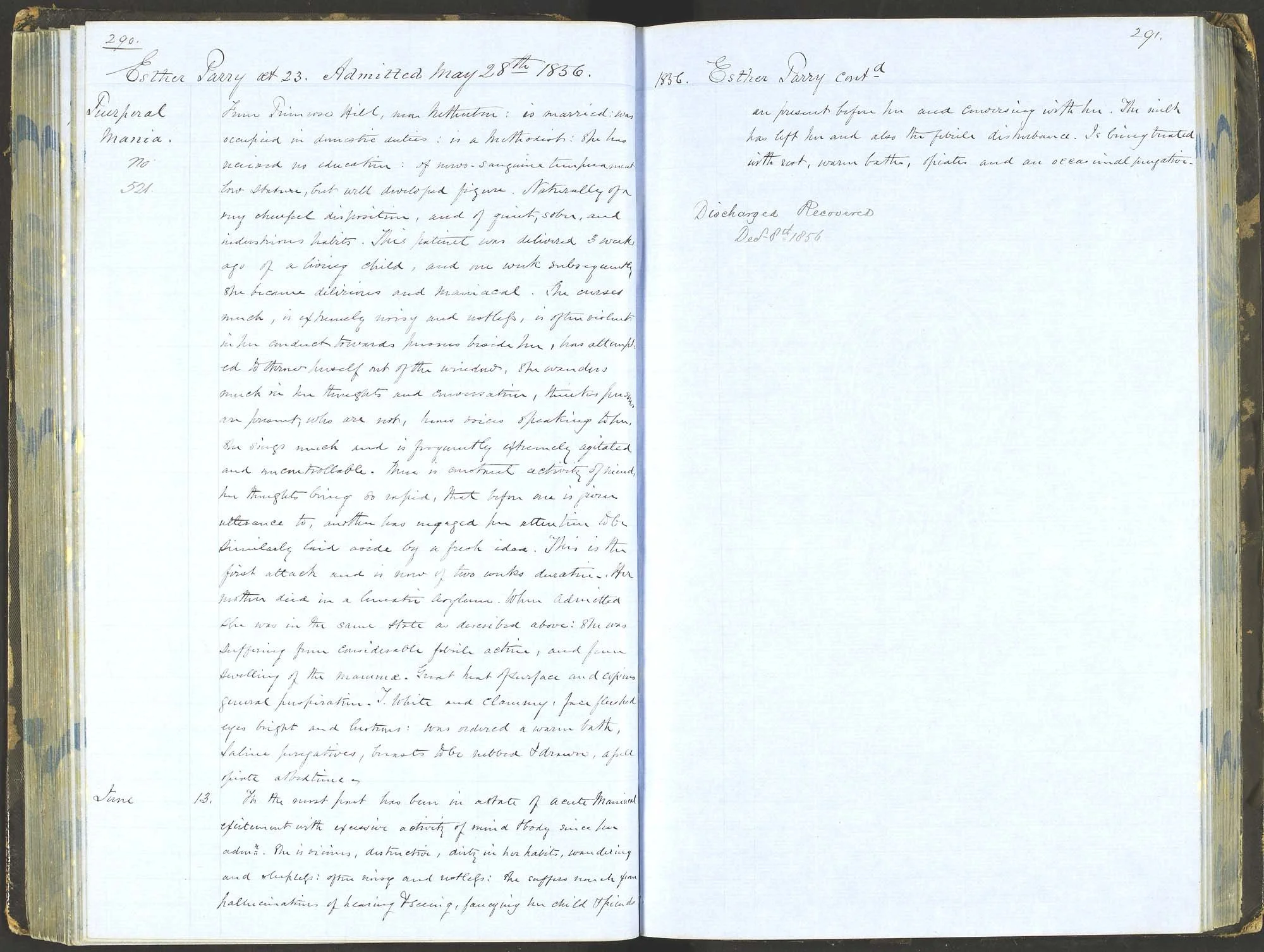Two weeks after her admission she continued to have many symptoms including “hallucinations of hearing” and “maniacal excitement.” Staff also noted their method of treatment which involved “rest, warm baths, opiates and an occasional purgative.” Esther was discharged just under seven months after her admission.