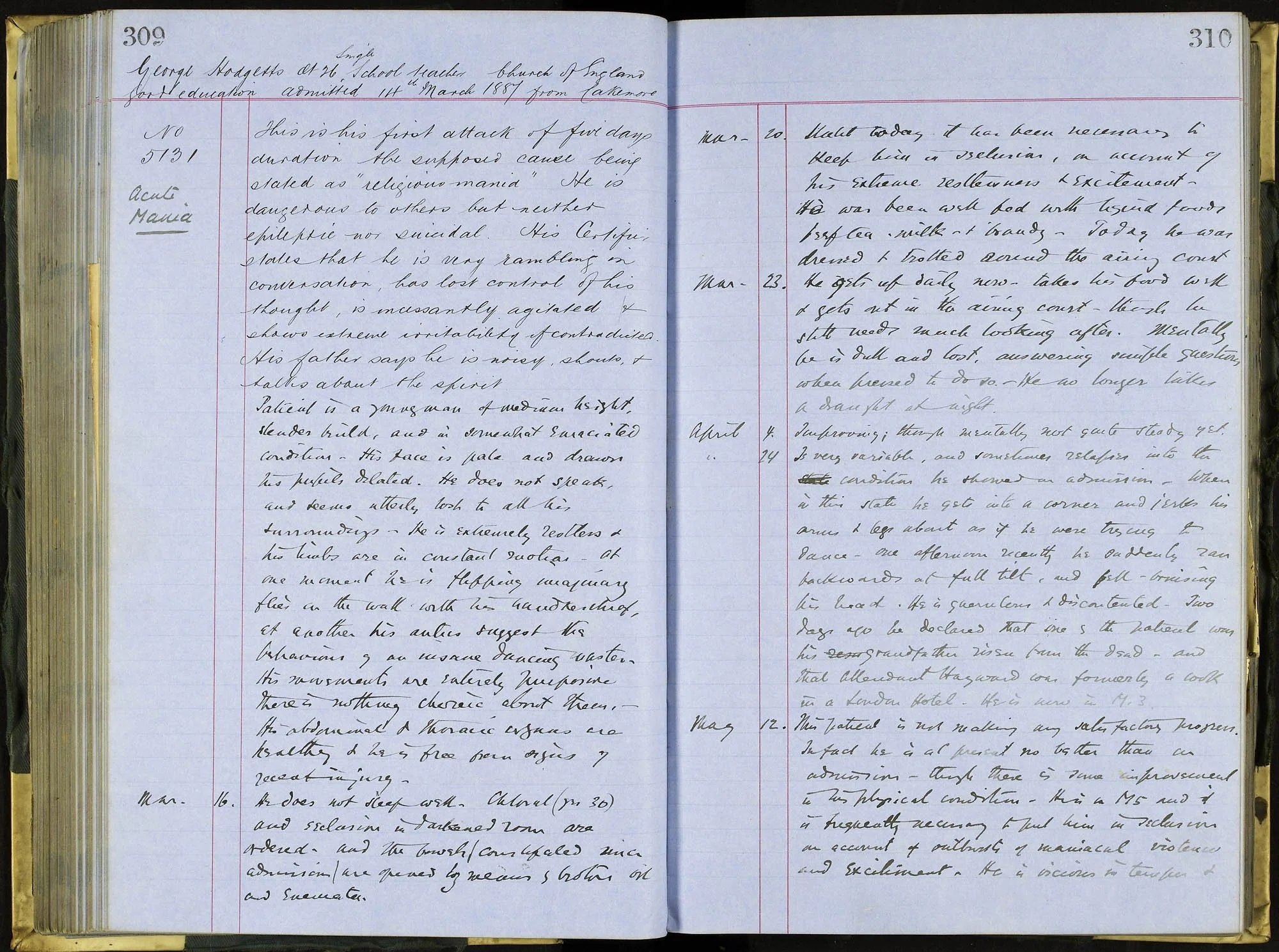 It was on 14 March1887 that George was admitted to the asylum with acute mania. His patient record describes him as…
