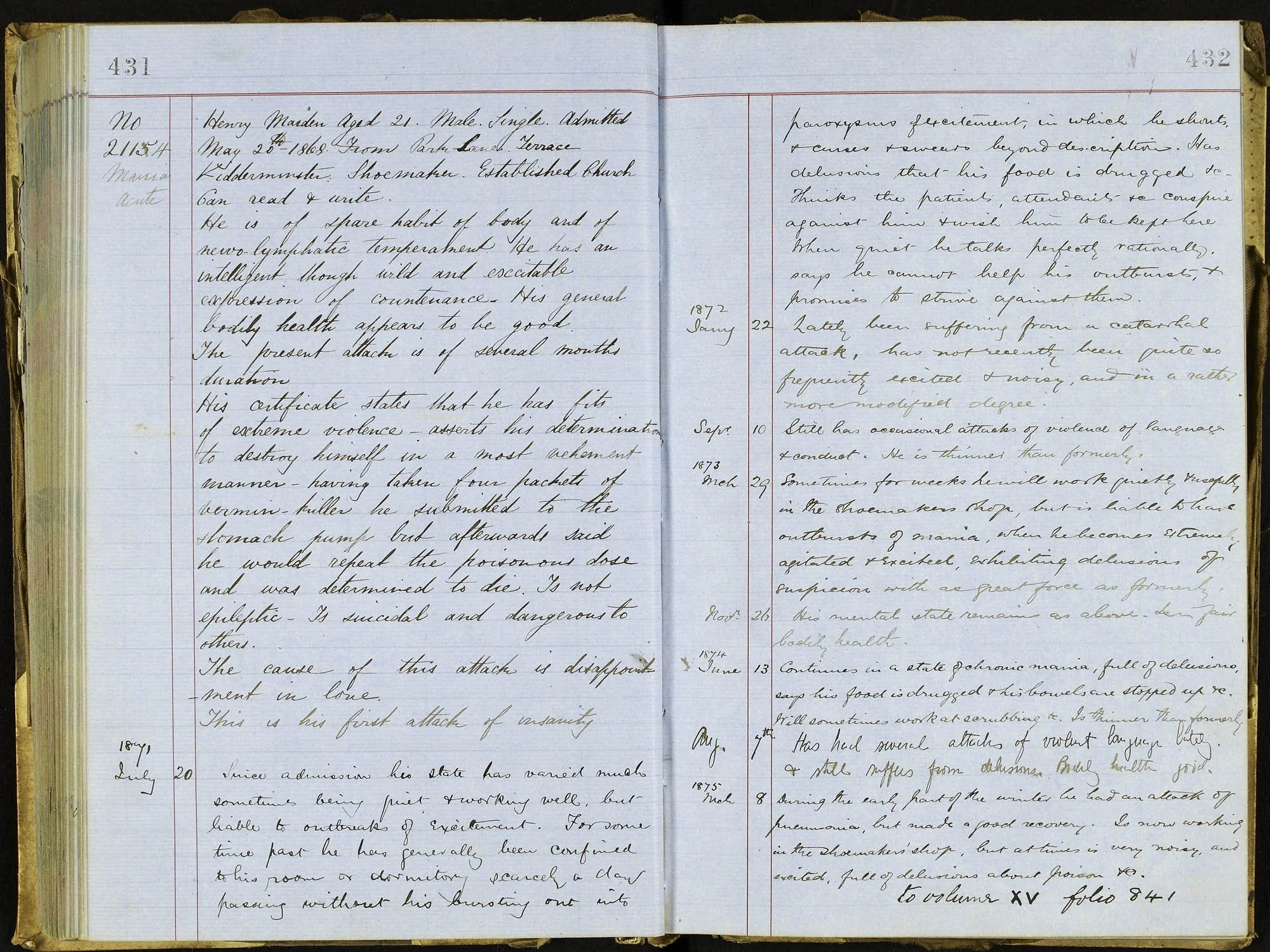 Unfortunately, we do not have a complete set of Henry’s case notes. The volumes containing case notes for the last two years of his first incarceration, and the volumes for the last eleven years of his second incarceration are either missing, or were never deposited at the Hive. Therefore, it is not possible to have a complete record of his time at Powick.