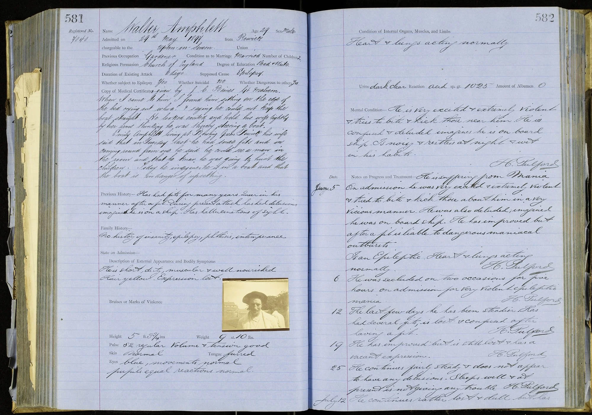 A few months later, on 29 May 1897, Walter was admitted to Powick Lunatic Asylum, the supposed disorder being epilepsy. His wife Emily states that ‘he had some fits and on coming round from one he said he could see a man in the room and that the he knew he was going to hurt the children.’ The case notes state that ‘he has had fits for many years.’
