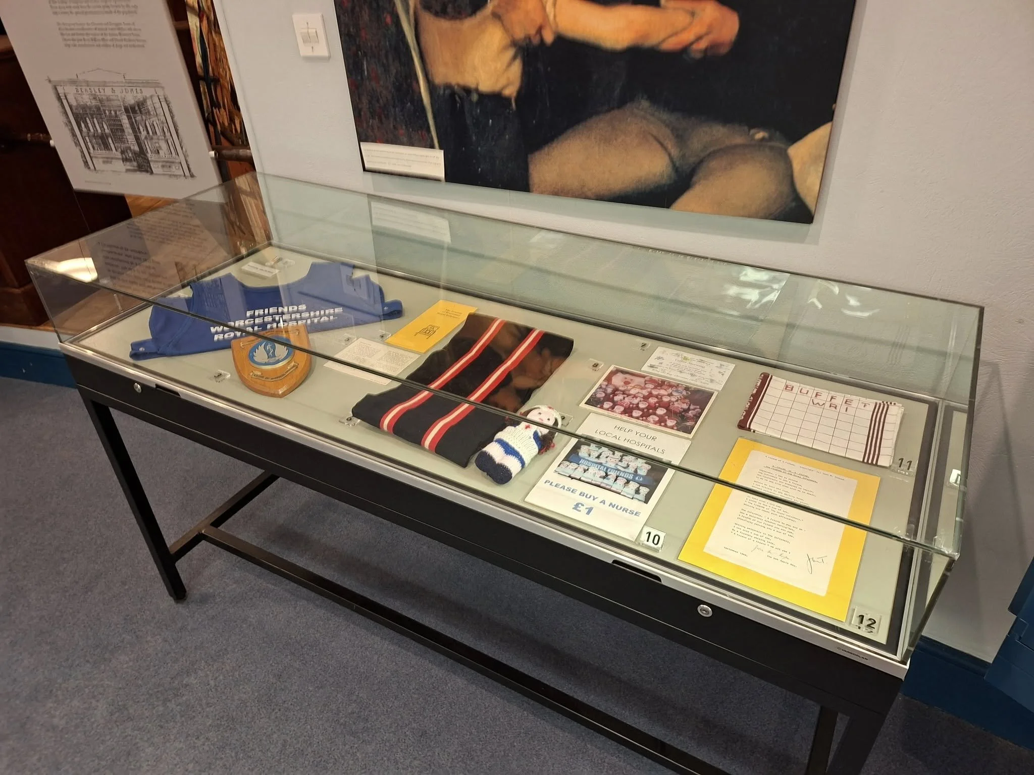 A display of commemorative artefacts relating to the history of the hospital league of friends. The League was originally set up to help to raise funds for the former Worcester Royal Infirmary, which at the time included the branch hospitals at Castle Street, Ronkswood and Snow Hill in Worcester before the opening of the Worcestershire Royal Hospital in 2002. Funds were usually raised for something specific, and for the benefit of the patients and visitors, for example a piece of medical or surgical equipment or a bench for visitors to sit on. The artefacts on display are largely from the collection of Mrs Doris Kershaw (1926-2025) the former Chair of the League of Friends, who, among other things managed the Castle Street branch’s buffet. The scarf and shield are part of Mr. George Marshall’s collection.